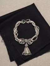 - Matériaux et techniques : Métal argenté, perles d’imitation, strass taille émeraude et taille ronde, serti griffe, fermoir à crochet Étiquette avec la mention « ROGER / SCÉMAMA »