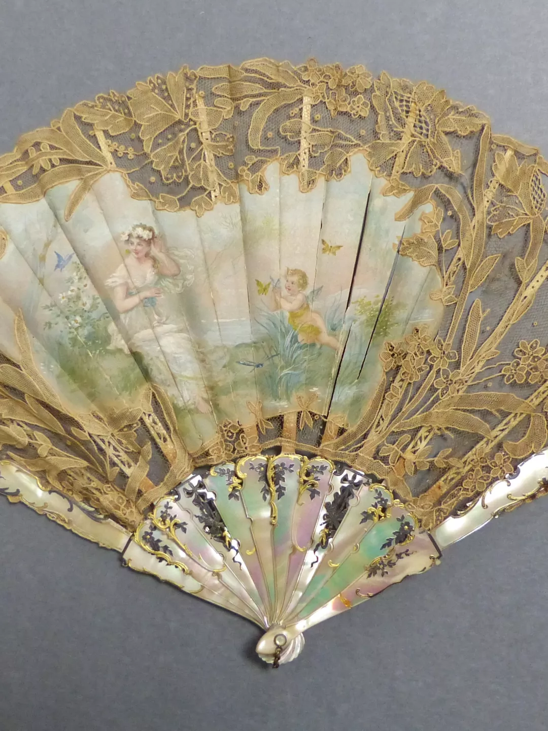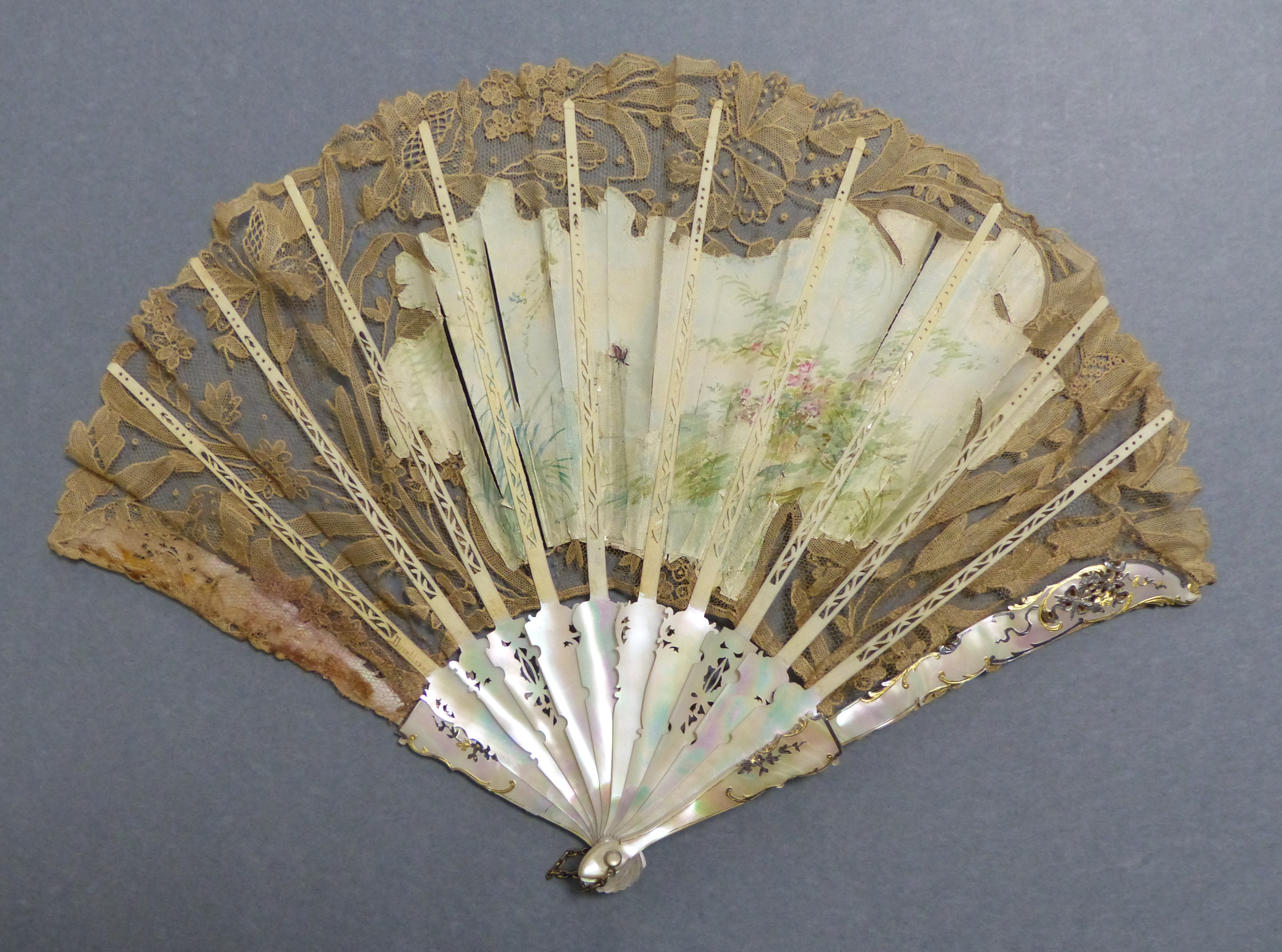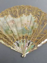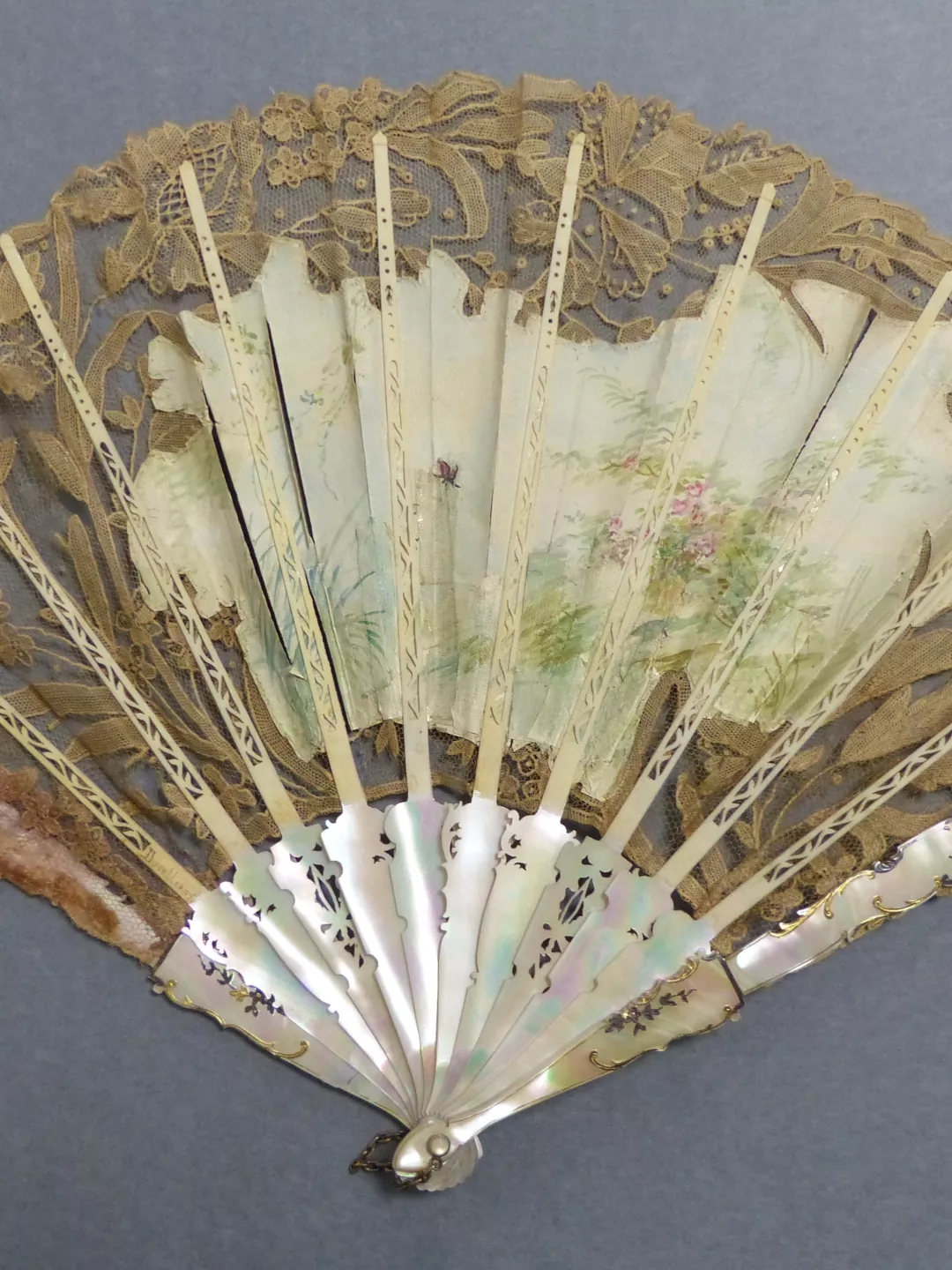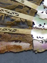 - Matériaux et techniques : Feuille en dentelle au point de gaze, cartouche en parchemin et papier peint à la gouache, monture en nacre d’Orient repercée, gravée, dorée et argentée, bouts en os, bélière en chaînette de métal argenté, rivure en métal, oeil en nacre Signatures « Lasel