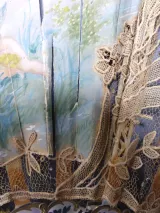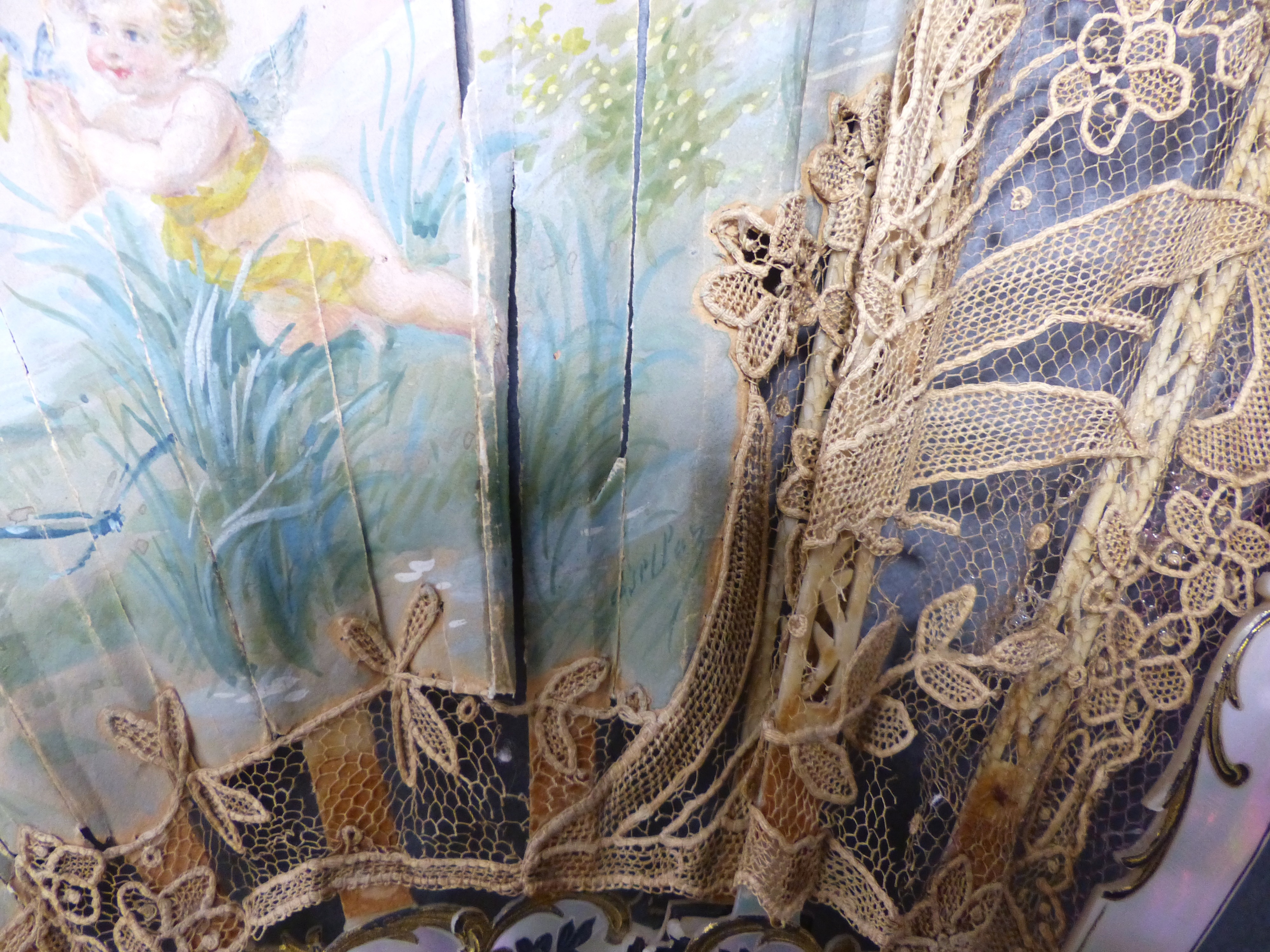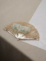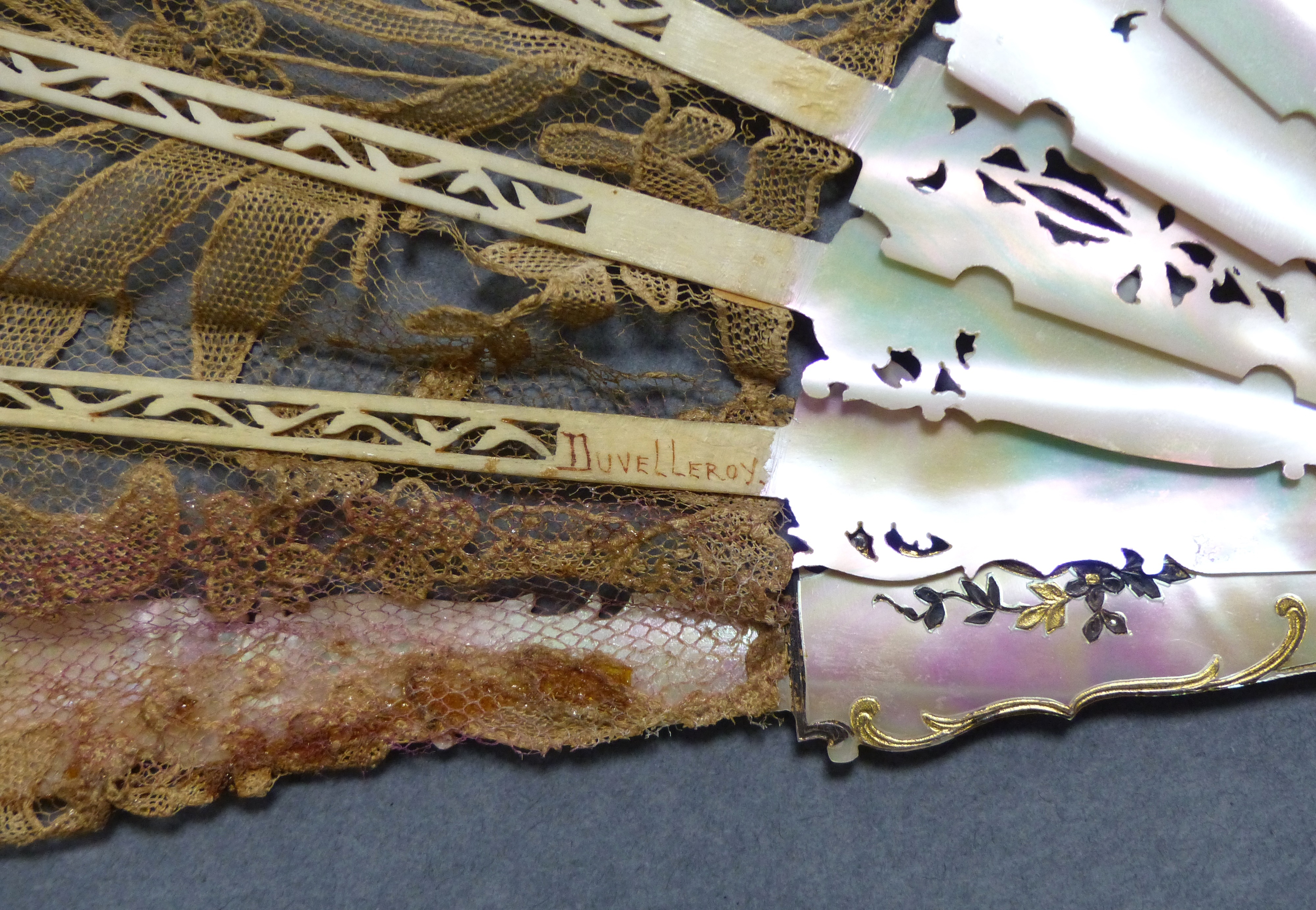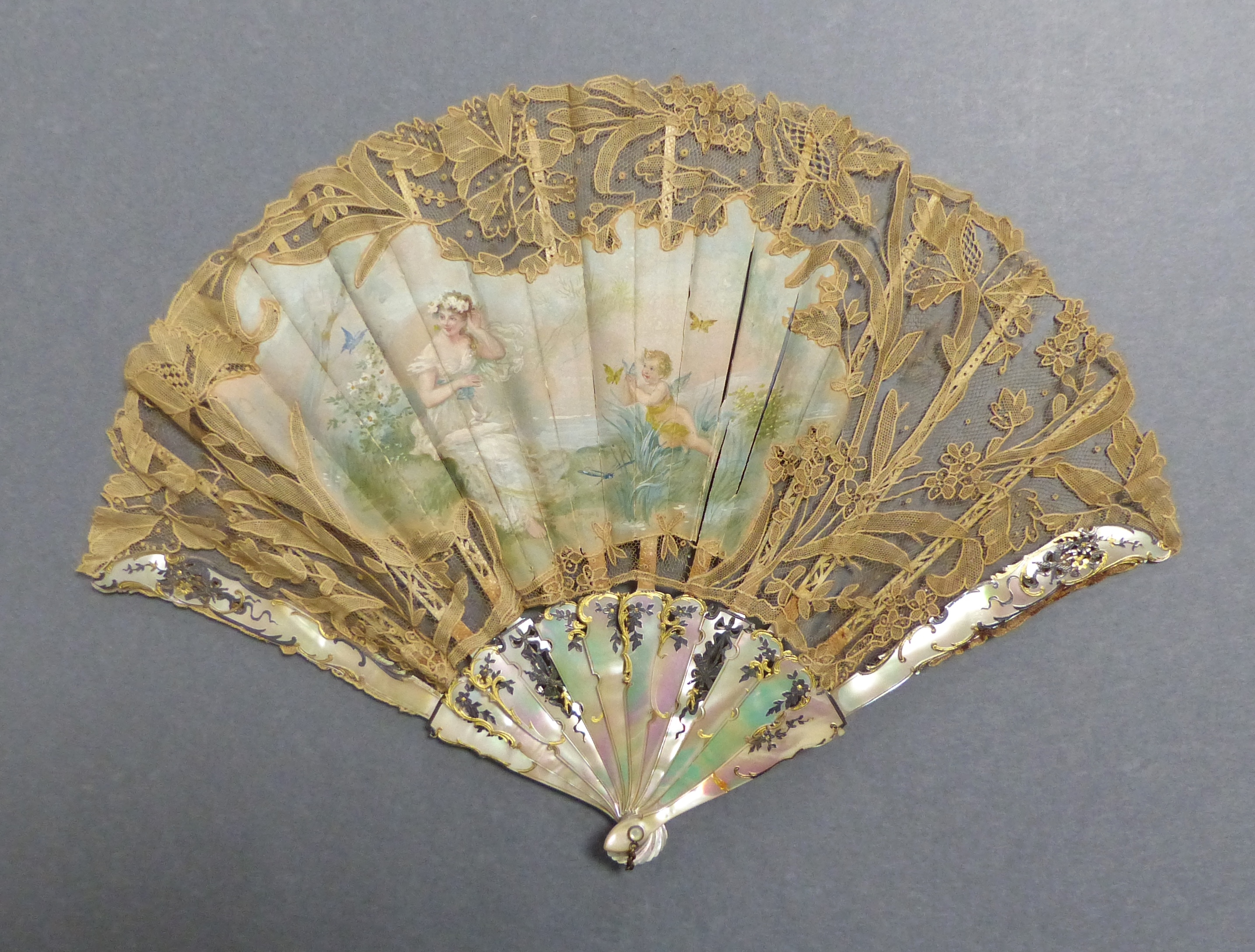 - Matériaux et techniques : Feuille en dentelle au point de gaze, cartouche en parchemin et papier peint à la gouache, monture en nacre d’Orient repercée, gravée, dorée et argentée, bouts en os, bélière en chaînette de métal argenté, rivure en métal, oeil en nacre Signatures « Lasel