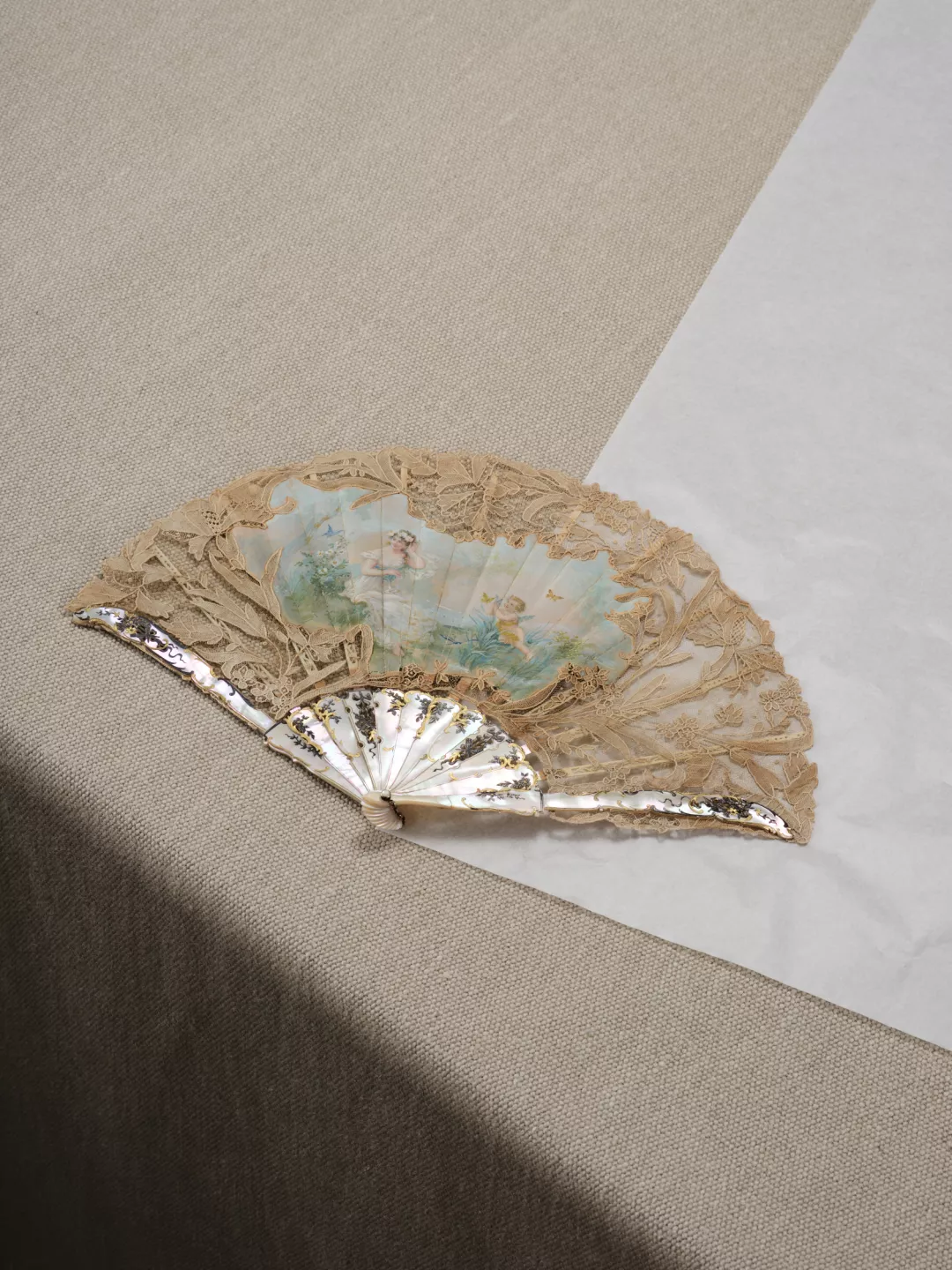 Le Palais Galliera conserve une riche collection d’éventails composée de plus de deux mille pièces : éventails de mode, d’actualité, publicitaires, en plumes… datés du XVIIIe au XXe siècle. Beaucoup d’entre eux sont entrés au musée grâce à de généreux dons, notamment ceux du Cercle de l’éventail, association d’amateurs créée en 1985 à la suite de l’exposition « L’éventail, miroir de la Belle Époque », et qui contribue, depuis, à l’enrichissement du département Accessoires. Cet éventail, daté vers 1900, présente, au centre d’une feuille de dentelle au décor végétal foisonnant, un cartouche orné d’une jeune femme assise au bord de l’eau. Vêtue d’une robe blanche vaporeuse dégageant sensuellement ses épaules, elle porte une délicate couronne de fleurs. Un putto jouant avec papillons et libellules l’accompagne. La composition est signée « Lasellaz », femme peintre éventailliste, qui a simultanément travaillé pour les maisons Duvelleroy et Kees. Elle s’inscrit pleinement dans l’esprit de l’Art nouveau, qui a fait de la femme et de son symbolisme l’un de ses principaux thèmes. À la Belle Époque, les éventails se couvrent de figures féminines empreintes de sensualité, personnifications de la beauté, du jour et de la nuit, du crépuscule et de l’aurore, de la Lune et du Soleil, de l’air et de l’eau, du temps… L’un des brins porte, à son revers, la signature « Duvelleroy », preuve que l’œuvre a été réalisée par l’un des plus célèbres éventaillistes parisiens, du nom de la maison fondée en 1827 par Jean-Pierre Duvelleroy, qui a créé et fabriqué les éventails à la dernière mode durant plus d’un siècle.
