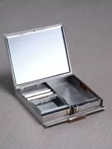 Si certaines minaudières sont réalisées en laque ou en or, celle conservée au Palais Galliera, à motif de grain d’orge, est fabriquée en Styptor, un « alliage de métaux communs » (or, argent, cuivre, nickel, palladium et zinc) déposé par Van Cleef & Arpels au greffe du tribunal de commerce de la Seine en 1932, sous le numéro 281292, « pour la fabrication d’objets de bijouterie et d’orfèvrerie ». Afin de répondre aux besoins des femmes, l’objet se compose de divers compartiments et accessoires : boîte à fard, nécessaire, briquet, vide-poche, peigne, miroir et étui à cigarettes. Conservées dans les archives de la maison joaillière, la facture et les pancartes de la minaudière (numéro 41324) et du briquet (numéro 41325) donnent une date précise de création : le 27 juillet 1934. Le mystère reste toutefois entier quant à l’identité de l’élégante qui arbora cet accessoire emblématique des années 1930.
