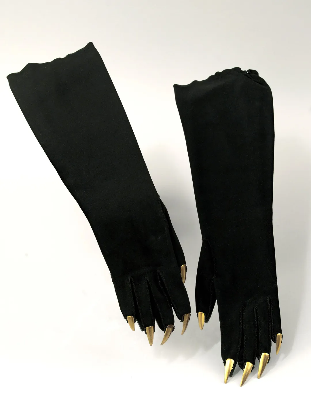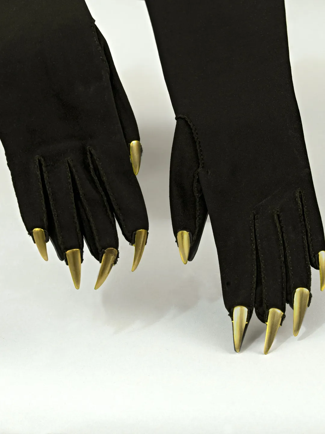 Proche des surréalistes, Elsa Schiaparelli mêle l’art et la mode avec humour et audace. Sa collaboration avec Salvador Dali débute ainsi lors de la collection hiver 1936-1937. Elle reprend le thème de la main, cher aux surréalistes, à travers ses boucles de ceinture, boutons, clips et gants. Cette paire de gants « griffes », comme celle aux ongles rouges en peau de serpent du Philadelphia Museum of Art, évoque la photographie des mains peintes par Picasso, prise par Man Ray en 1935.