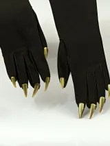 - Matériaux et techniques : Veau-velours, application de faux ongles en métal doré, couture sellier, couture piquée.