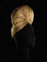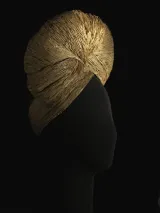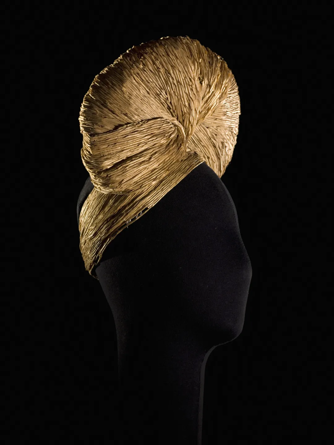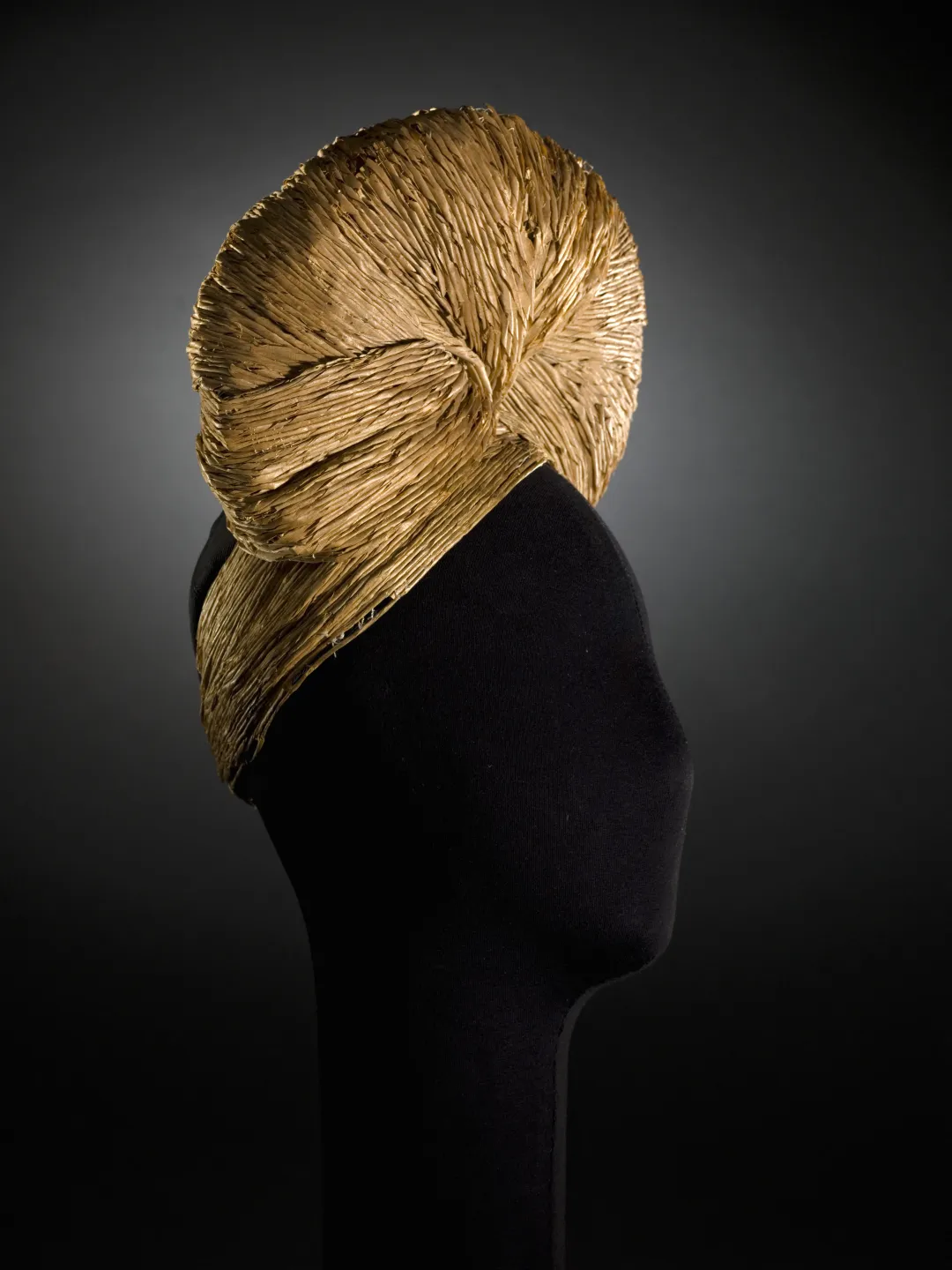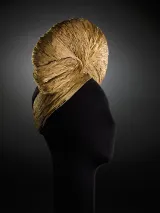 Durant les années noires de l’Occupation, bottiers, maroquiniers et modistes doivent faire face aux pénuries de matières premières et font preuve d’imagination en s’appropriant les matériaux les plus surprenants. Emblématique de cette période et de cette volonté de créer au-delà des difficultés, ce turban de Jeanne Lanvin daté de 1942 est une prouesse technique réalisée en ficelle de paille. Il témoigne également de l’extravagance des chapeaux au cours de la guerre, souvent dernier refuge de la création, et tout particulièrement du goût prononcé des modistes et des femmes pour le turban. Cette coiffure si pratique, notamment à bicyclette, protège du froid et dissimule une chevelure que l’on ne peut entretenir régulièrement.