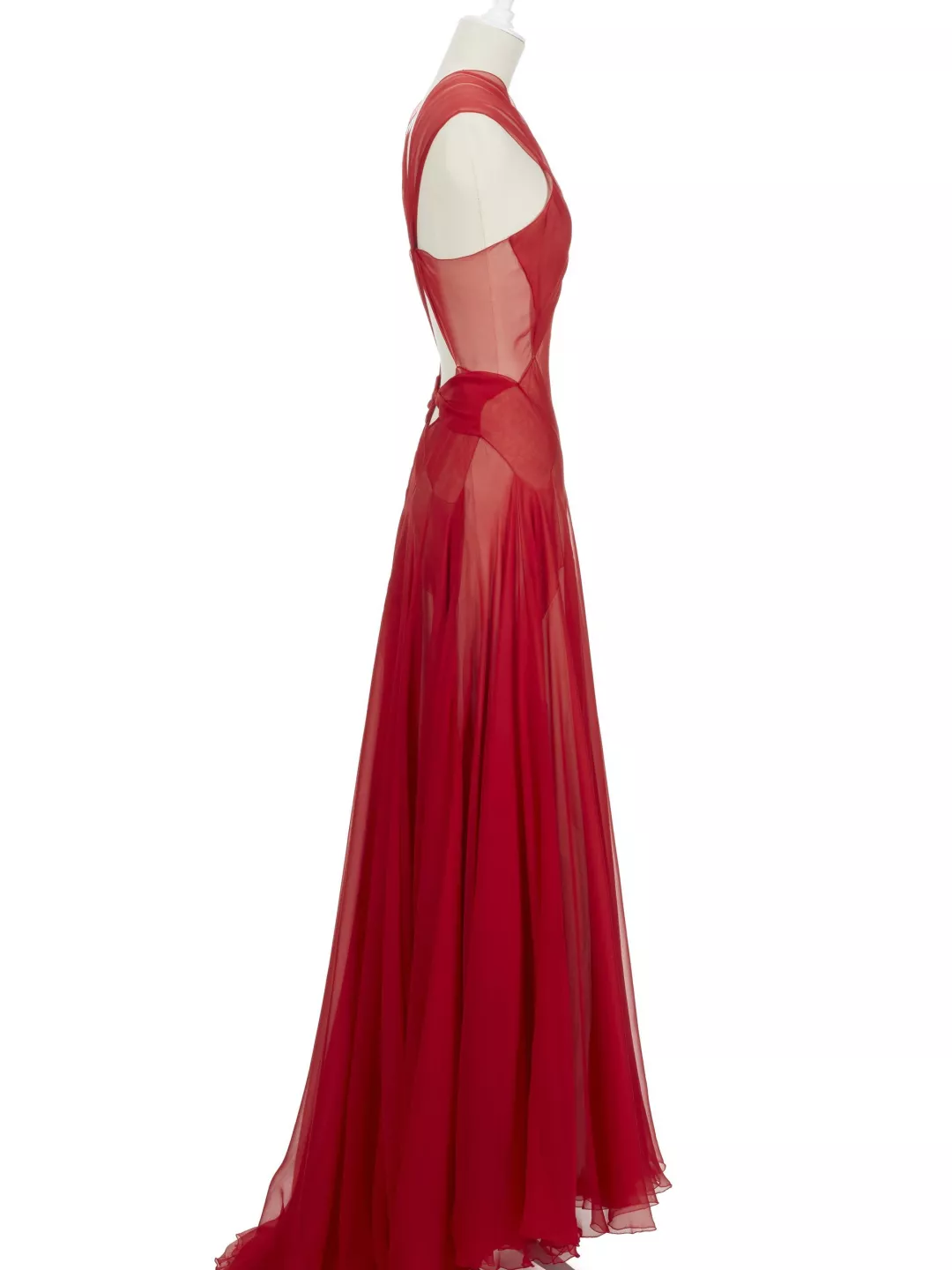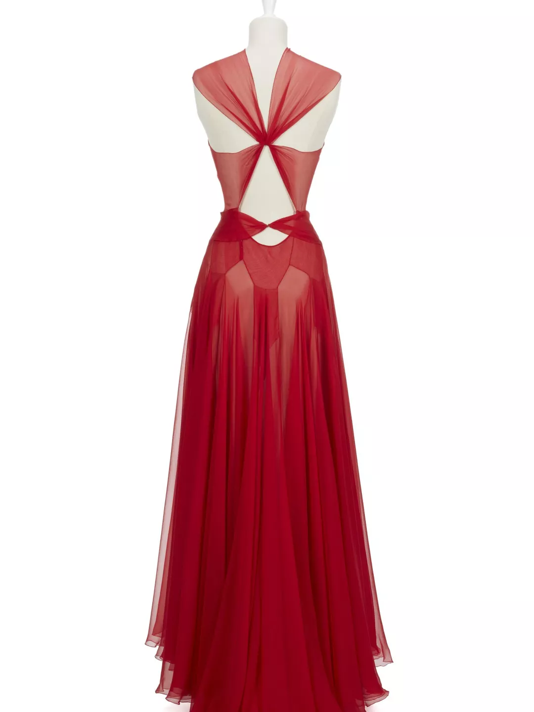 Azzedine Alaïa a toujours admiré l’œuvre de Madeleine Vionnet. La couleur rouge, la coupe en biais en mousseline de soie, les découpes en pointes, la nudité feinte et le dos nu au décolleté savant formé par des twists (tissu torsadé) sont autant d’hommages du créateur à la couturière.