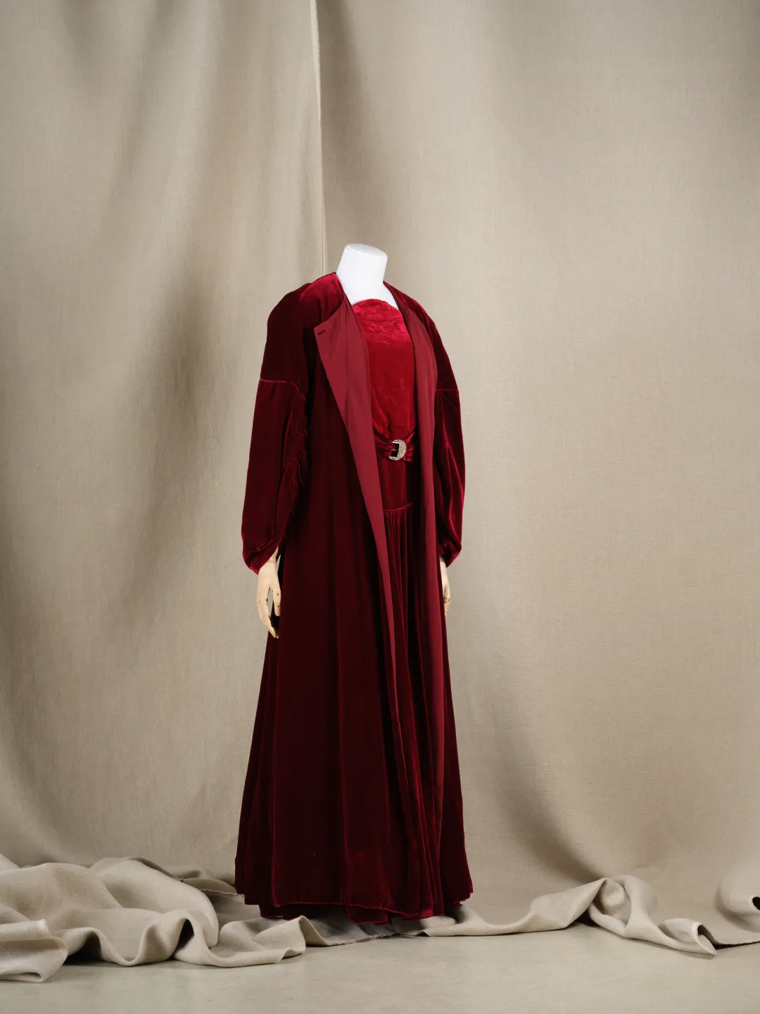 - Matériaux et techniques : Robe et manteau en velours de soie rouge grenat ; ceinture assortie à boucle métallique ornée de strass ; corsage en velours de soie rouge clair Corsage griffé « NICOLE GROULT / 25 faubourg St Honoré » Manteau griffé « NICOLE GROULT / 29 RUE D’ANJOU 29 »