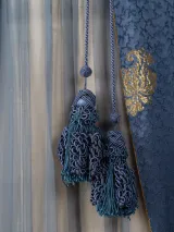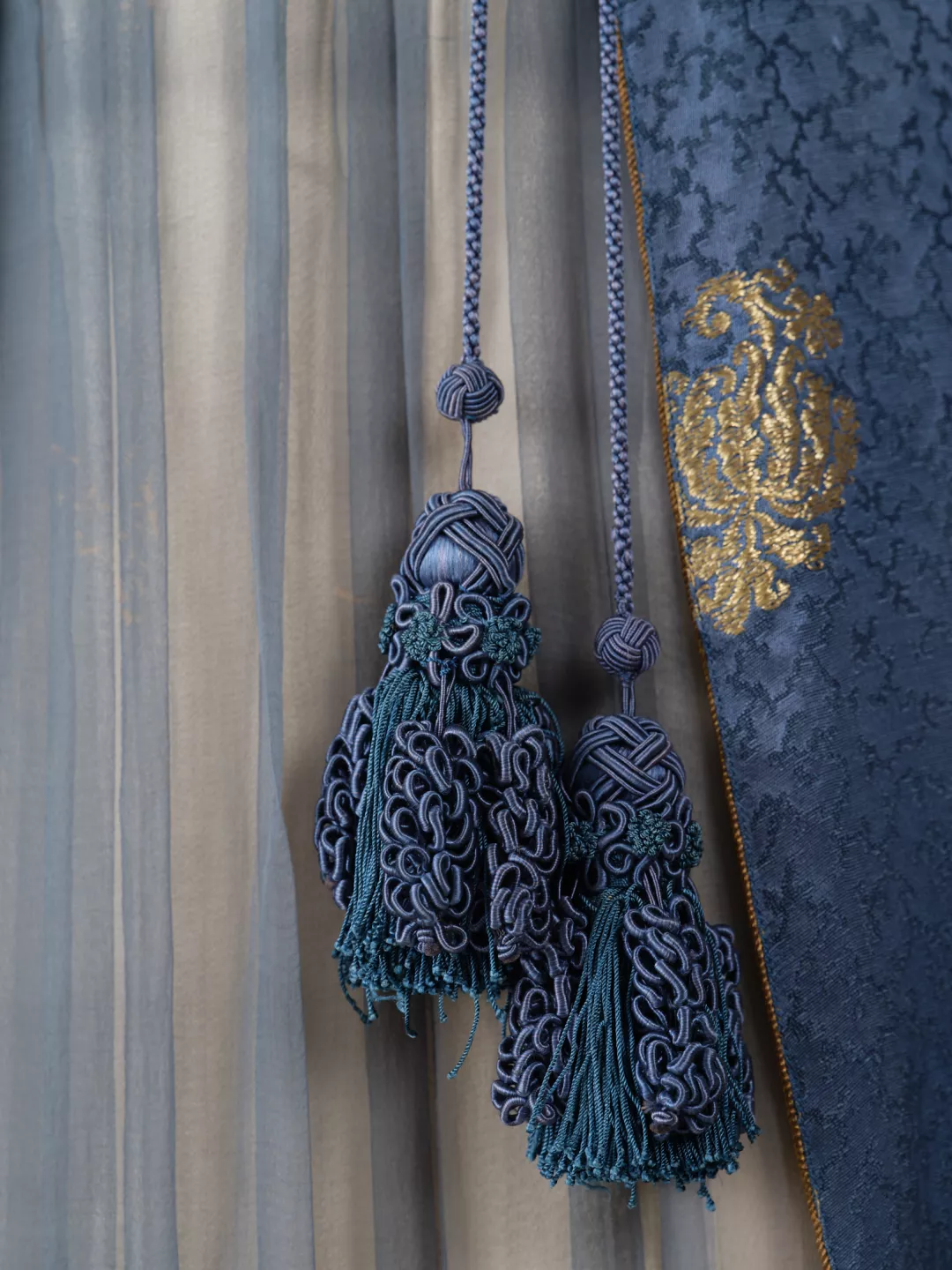 - Matériaux et techniques : Damas de soie bleu broché de fils dorés, mousseline de soie bleue, dentelle de filé métallique or ; fond en satin de soie ivoire ; glands en passementerie de soie bleue Griffe « [rose] PAUL POIRET / a Paris »