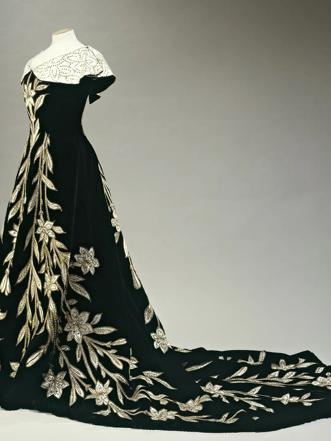 Devenue l’une des figures majeures du Tout-Paris, non seulement par sa position sociale et son élégance souveraine, mais aussi par sa culture et son intelligence, la comtesse protégea les arts, et fut l’une des inspiratrices principales de Marcel Proust, qui trouva en elle le modèle de la duchesse de Guermantes. Cousine de Robert de Montesquiou, elle lui inspira certains poèmes, dont un sonnet qui se terminait par ces vers : « Beau lis qui regardez avec vos pistils noirs », cette robe en est sans doute un écho. Son décolleté – dont la berthe a été modifiée par la suite, certainement du temps de sa propriétaire – pouvait d’ailleurs se rabattre pour former des ailes de chauve-souris, animal emblématique de Montesquiou, faisant de cette pièce une véritable robe-poème.