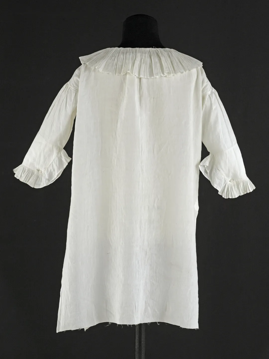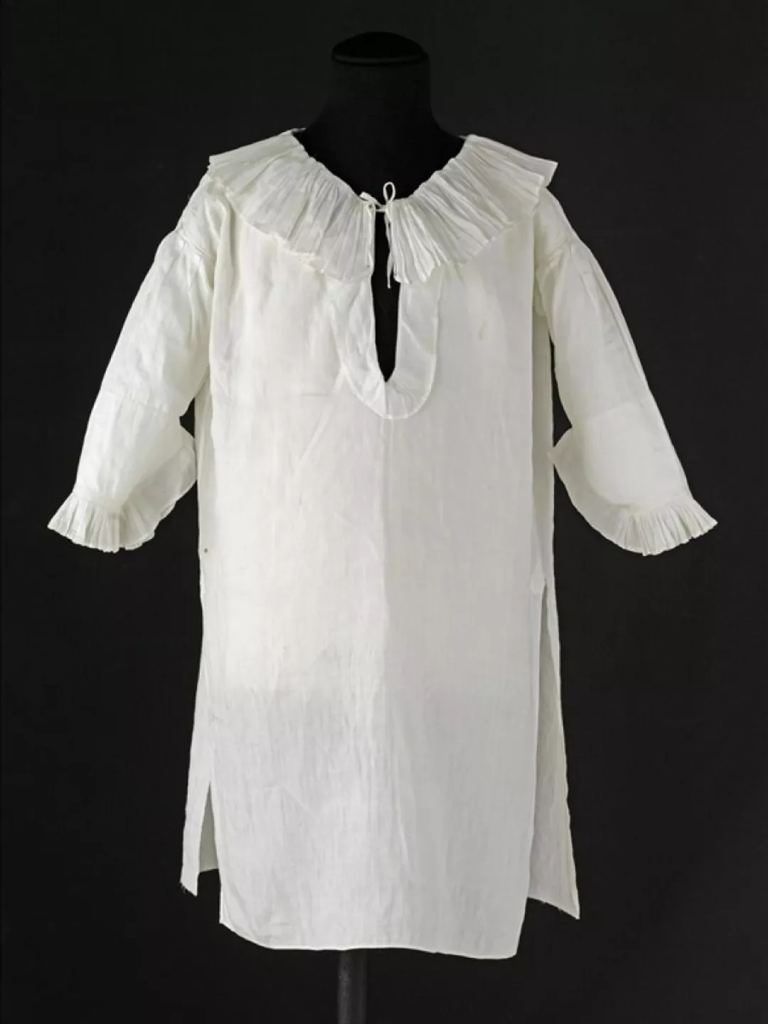 Jusqu’à l’âge de cinq ans, fillettes et garçonnets portent des chemises aux formes semblables à celles des femmes. Passé cet âge, les garçons ont alors droit à deux vêtements masculins, de dessous et de dessus, la chemise et la culotte. La chemise du duc de Normandie est une chemise d’homme : encolure arrondie ouverte et volantée, forme droite et non évasée, fentes latérales au bas de la chemise, manches longues, ici boutonnées. Elle est coupée dans une toile de lin très fine de grande qualité. Les coutures particulièrement soignées sont proches de celles d’un corsage qui aurait appartenu à la reine Marie-Antoinette, lui aussi conservé à Galliera. La chemise est marquée d’une petite couronne brodée au point de croix, en fils de soie rouge, placée sur l’un de ses côtés.