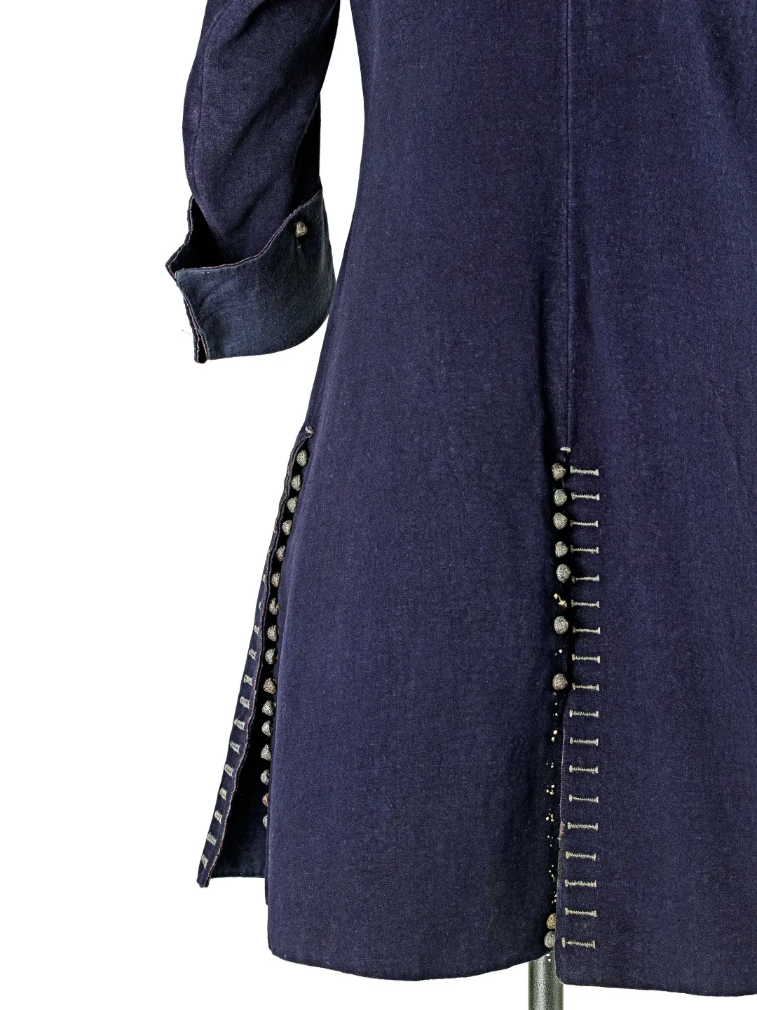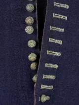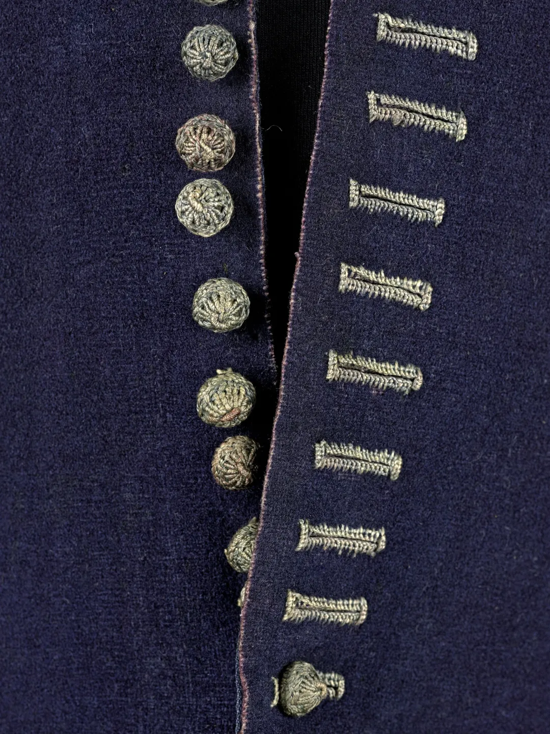 L’habit est exemplaire du vêtement dit « justaucorps », de plus en plus présent dans le vestiaire quotidien masculin de la seconde moitié du XVIIe siècle. Ce petit manteau mi-long rompt avec le pourpoint court réchauffé d’une cape, apprécié jusque dans les années 1660. Il pourrait dériver d’un vêtement militaire, peut-être de l’hongreline, veste fourrée enfilée sur la cuirasse afin d’éviter son refroidissement, ou encore du manteau long porté par les soldats mercenaires venus de l’Est pendant la guerre de Trente Ans.