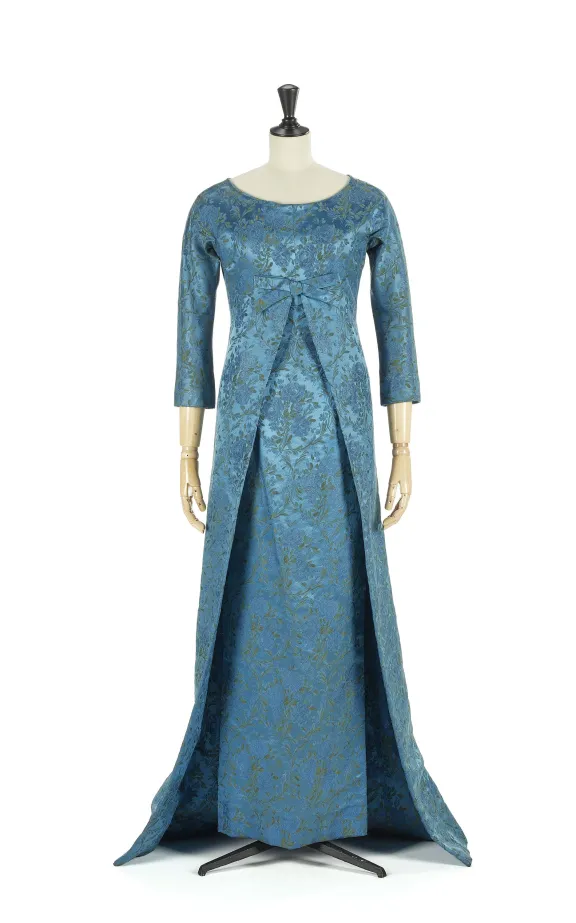 La collection Christian Dior de la donation est tout aussi remarquable. Dès la fin des années 1940, Jacqueline de Ribes s’intéresse à la maison fondée par Christian Dior, qu’elle visite grâce à son oncle Étienne de Beaumont. Certaines pièces sont des commandes spéciales, réservées à une cliente dont la notoriété et l’exigence suffisent à convaincre les ateliers. C’est le cas de la robe en broché d’or et zibeline portée en 1970 à la première de Médée de Pasolini.