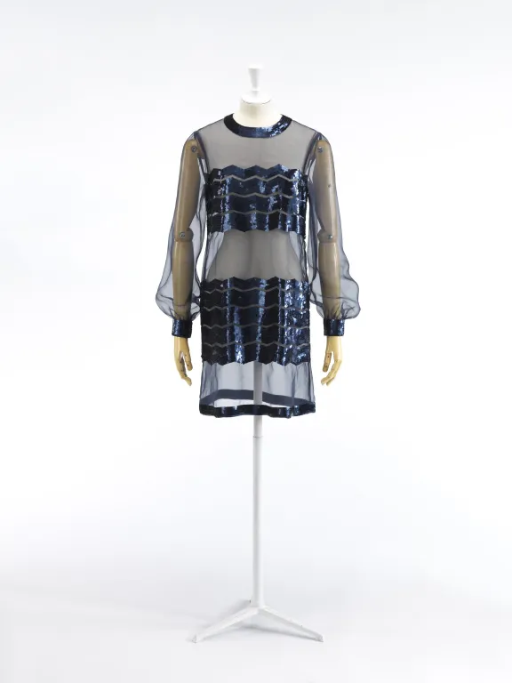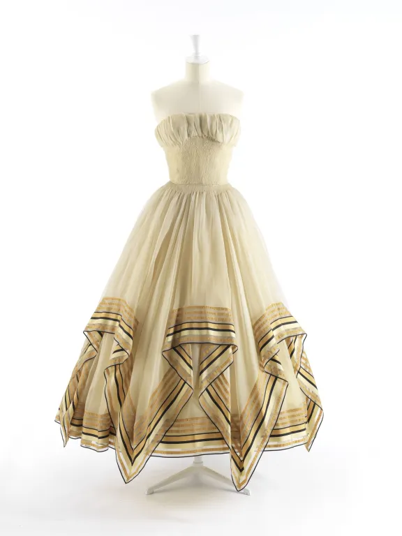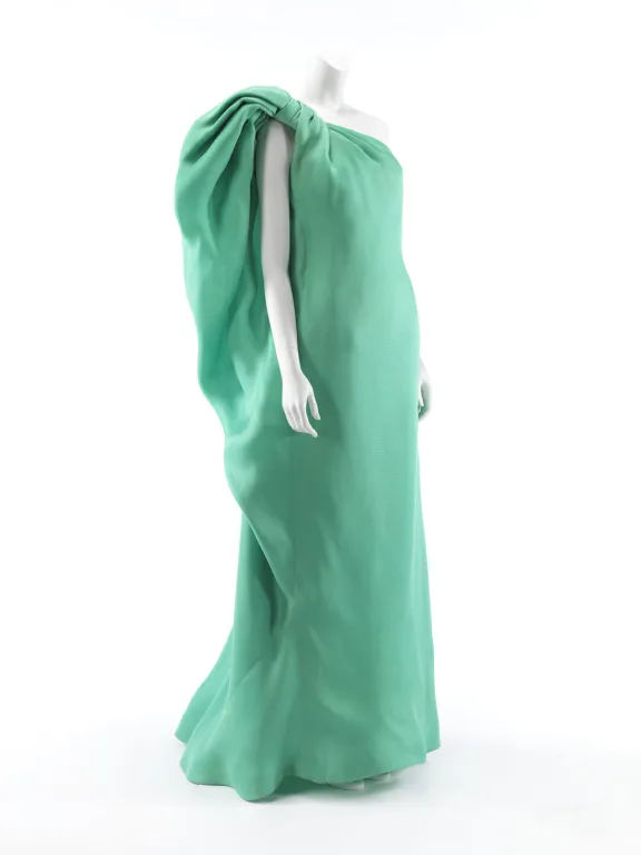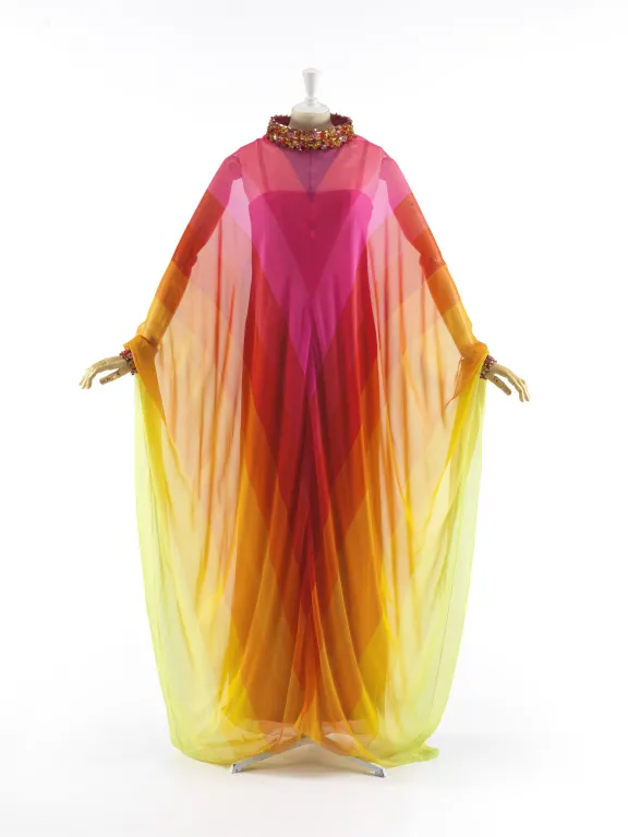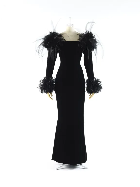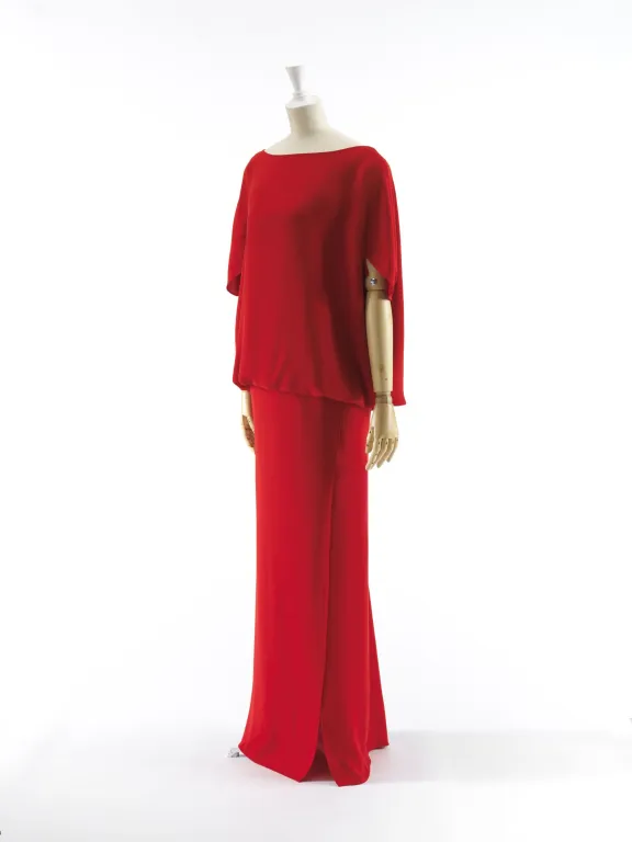 Certains ensembles conservés au Palais Galliera témoignent de moments clés de l’histoire de la mode. L’ensemble porté lors du « Grand divertissement de Versailles » en novembre 1973 — événement resté célèbre sous le nom de Battle of Versailles — inscrit Jacqueline de Ribes au cœur d’un basculement majeur, consacrant l’émergence des créateurs américains sur la scène internationale. Par sa présence et son allure, elle participe pleinement à cette scène fondatrice où la mode devient spectacle et affirmation culturelle.