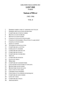 GRANDS MAGASINS DU LOUVRE PARIS Saison d'Hiver 1905-1906 VOL-8 1 S OIERIES NOIRES UNIES ET ARMURES NOUVELLES 2 S OIERIES SPÉCIALES POUR DOUBLURES 3 C OMPTOIR DES ETOFFES NOIRES 4 M ANTEAUX DE FOURRURE 5 M ANTEAUX POUR DAMES 6 C HAPEAUX ÉLÉGANTS POUR DAMES 7 C HAPEAUX POUR BEBES . F ILLETTES ET GARÇONNET 8 C HAPEAUX POUR DAMES 9 J UPES ET JUPONS 10 V ÊTEMENTS POUR FILLETTES 11 C OMPTOIR DES LAYETTES 12 C ORSAGES ET LINGERIE 13 C OMPTOIR DES DENTELLES 14 C OMPTOIR DES FICHUS 15 C OMPTOIR DES FOURRURES 16 T RICOTS 17 C OMPTOIR DES RUBANS 18 G ANTS DE TISSUS 19 M ERCERIE 20 C OMPTOIR DE PASSEMENTERIE 21 C HAUSSURES POUR DAMES ET ENFANTS 22 B ONNETERIE POUR DAMES 23 B ONNETERIE POUR ENFANTS 24 C RAVATES ET FOULARDS 25 C HEMISES POUR HOMMES 26 C EINTURES ET PLASTRONS HYGIENIQUES 27 C OMPTOIR DES MOUCHOIRS 28 L INGE DE TABLE 29 C OMPTOIR DES TOILES 30 A MEUBLEMENT