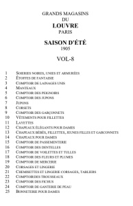 GRANDS MAGASINS DU LOUVRE PARIS SAISON D'ÉTÉ 1905 VOL-8 1 S OIERIES NOIRES , UNIES ET ARMURÉES 2 É TOFFES DE FANTAISIE 3 C OMPTOIR DE LAINAGES UNIS 4 M ANTEAUX 5 C OMPTOIR DES PEIGNOIRS 6 C OMPTOIR DES JUPONS 7 J UPONS 8 C ORSETS 9 C OMPTOIR DES GARÇONNETS 10 V ÊTEMENTS POUR FILLETTES 11 L AYETTES 12 C HAPEAUX ÉLÉGANTS POUR DAMES 13 C HAPEAUX BÉBÉS , FILLETTES , JEUNES FILLES ET GARCONNETS 14 C HAPEAUX POUR DAMES 15 C OMPTOIR DE PASSEMENTERIE 16 C OMPTOIR DES DENTELLES 17 C OMPTOIR DE VOILETTES ET TULLES 18 C OMPTOIR DES FLEURS ET PLUMES 19 C OMPTOIR DE MERCERIE 20 C ORSAGES ET LINGERIE 21 C HEMISETTES ET LINGERIE CORSAGES , TABLIERS 22 C OMPTOIRDES TROUSSEAUX 23 C OMPTOIR DES FICHUS 24 C OMPTOIR DE GANTERIE DE PEAU 25 B ONNETERIE POUR DAMES