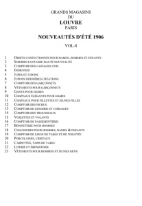 GRANDS MAGASINS DU LOUVRE PARIS NOUVEAUTÉS D'ÉTÉ 1906 VOL-8 1 O BJETS CONFECTIONNÉS POUR DAMES , HOMMES ET ENFANTS 2 S OIERIES FANTAISIE HAUTE NOUVEAUTÉ 3 C OMPTOIR DES LAINAGES UNIS 4 I NDIENNES 5 J UPES ET JUPONS 6 J UPONS DERNIÈRES CRÉATIONS 7 C OMPTOIR DES GARÇONNETS 8 V ÊTEMENTS POUR GARÇONNETS 9 G ANTS POUR DAMES 10 C HAPEAUX ÉLÉGANTS POUR DAMES 11 C HAPEAUX POUR FILLETTES ET JEUNES FILLES 12 C OMPTOIR DES FICHUS 13 C OMPTOIR DE LINGERIE ET CORSAGES 14 C OMPTOIR DES TROUSSEAUX 15 V OILETTES ET VOLANTS 16 C OMPTOIR DE PASSEMENTERIE 17 B ONNETERIE POUR HOMMES 18 C HAUSSURES POUR HOMMES , DAMES & ENFANTS 19 C OMPTOIR DE LINGE DE TABLE ET DE TOILETTE 20 P ORCELAINES , CRISTAUX 21 C ARPETTES , TAPIS DE TABLE 22 L ITERIE ET ÉBÉNISTERIE 23 V ÊTEMENTS POUR HOMMES ET JEUNES GENS