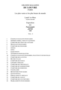 GRANDS MAGASINS DU LOUVRE PARIS Les plus vastes et les plus beaux du monde Lundi 1er Mars et jours suivants Exposition des Nouveautés d'ÉTÉ 1909 V OL - 9 1 C HAPEAUX ELEGANTS POUR DAMES 2 S OIERIES NOIRES , UNIES ET FAÇONNEES 3 C OMPTOIR DES TISSUS DE FANTAISIE 4 M ANTEAUX POUR DAMES 5 C OMPTOIR DES PEIGNOIRS 6 J UPONS 7 J UPES 8 G ARÇONNETS 9 V ÊTEMENTS POUR FILLETTES 10 C HAPEAUX ELEGANTS POUR BEBES , FILLETTES ET JEUNES FILLES 11 C OMPTOIR DES LAYETTES 12 R UCHES TULLES 13 C OMPTOIR DES FICHUS 14 L INGERIE CORSAGES 15 C OMPTOIR DES TROUSSEAUX 16 C OMPTOIR DE PASSEMENTERIE 17 C OMPTOIR DES INDIENNES 18 C HAPELLERIE 19 B ONNETERIE POUR DAMES 20 G ANTS DE PEAU 21 P ORCELAINES ET CRISTAUX 22 C OMPTOIR DE CALICOT 23 C OMPTOIR DES COUVERTURES 24 H ABILLEMENTS POUR HOMMES